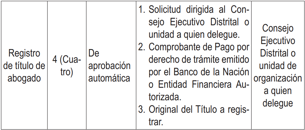Cuarto. Que, mediante Informe Nº 00038-2026-SM-GMPP-GG-PJ, de fecha 15 de febrero de 2026, la Subgerencia de Modernización evaluó el Texto Único de Procedimientos Administrativos (TUPA) del Poder Judicial y concluyó que, considerando que la unidad orgánica responsable de autorizar la inscripción del título de abogado es el Consejo Ejecutivo Distrital de cada Distrito Judicial y no la Gerencia de Administración Distrital o quien haga sus veces, conforme se encuentra previsto en el TUPA vigente aprobado por la Resolución Administrativa Nº 000266-2025-CE-PJ, procedió a formular la Tabla ASME y, conjuntamente con la Gerencia de Administración y Finanzas2, efectuó el costeo correspondiente; asimismo, señaló que, atendiendo a las dificultades prácticas que supondría la aplicación del procedimiento con autorización del Consejo Ejecutivo Distrital, planteó como alternativa delegar la aprobación de dicho procedimiento a la Gerencia u Oficina de Administración Distrital de la Corte Superior de Justicia respectiva, a fin de mantener el precio vigente y asegurar la atención dentro de los plazos establecidos en la normativa aplicable.