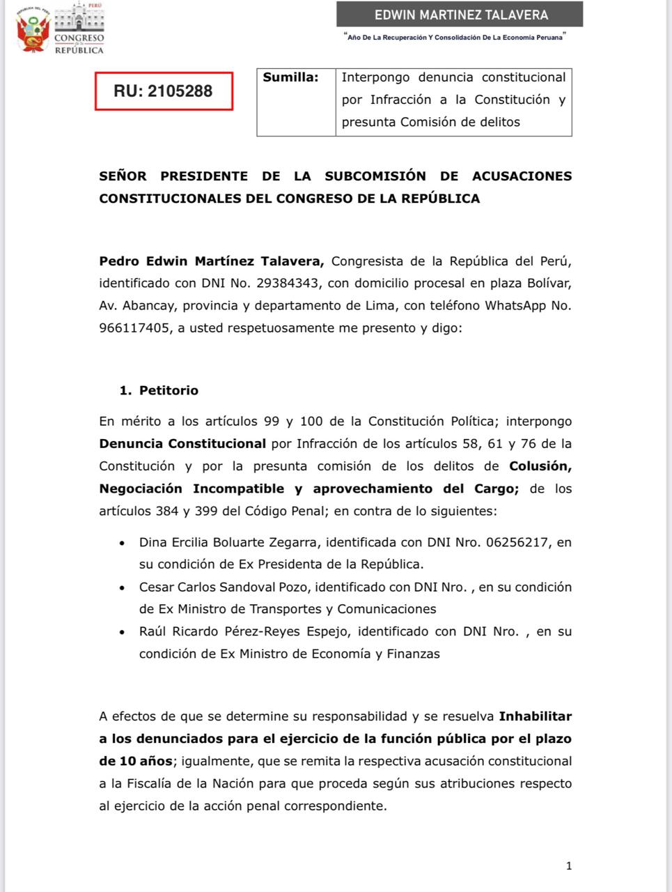 El congresista Pedro Edwin Martínez Talavera presentó una denuncia constitucional ante la Subcomisión de Acusaciones Constitucionales del Congreso contra la expresidenta Dina Boluarte Zegarra y los exministros César Sandoval Pozo y Raúl Pérez-Reyes Espejo. La acción se sustenta en la posible comisión de los delitos de colusión, negociación incompatible y aprovechamiento del cargo.