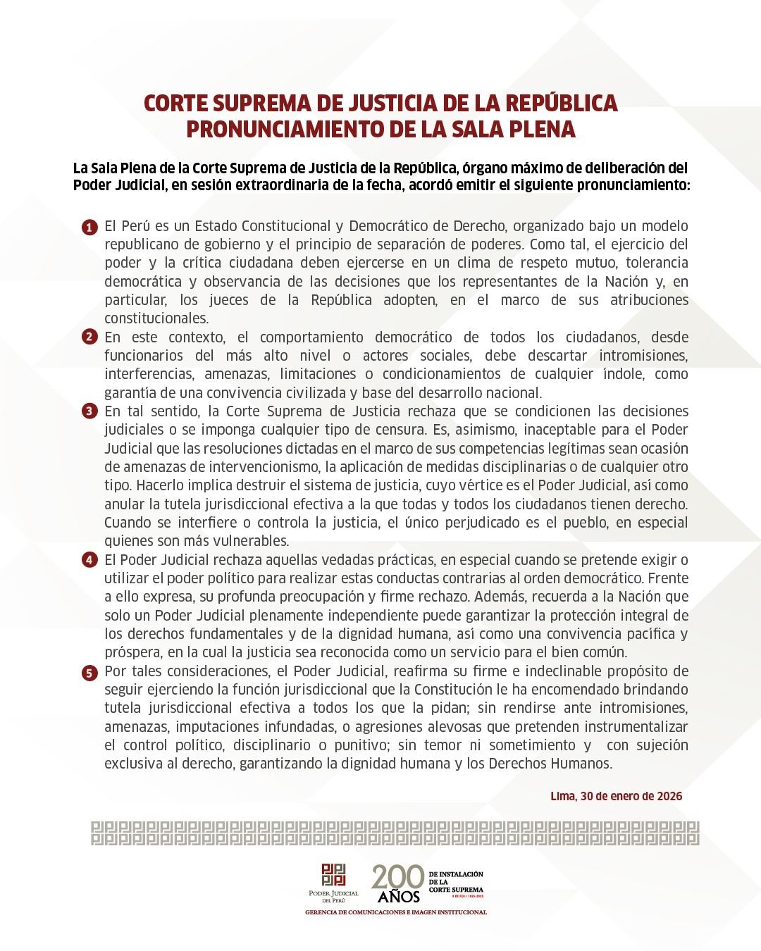 La Sala Plena de la Corte Suprema de Justicia de la República, órgano máximo de deliberación del Poder Judicial, en sesión extraordinaria de la fecha, acordó emitir el siguiente pronunciamiento: