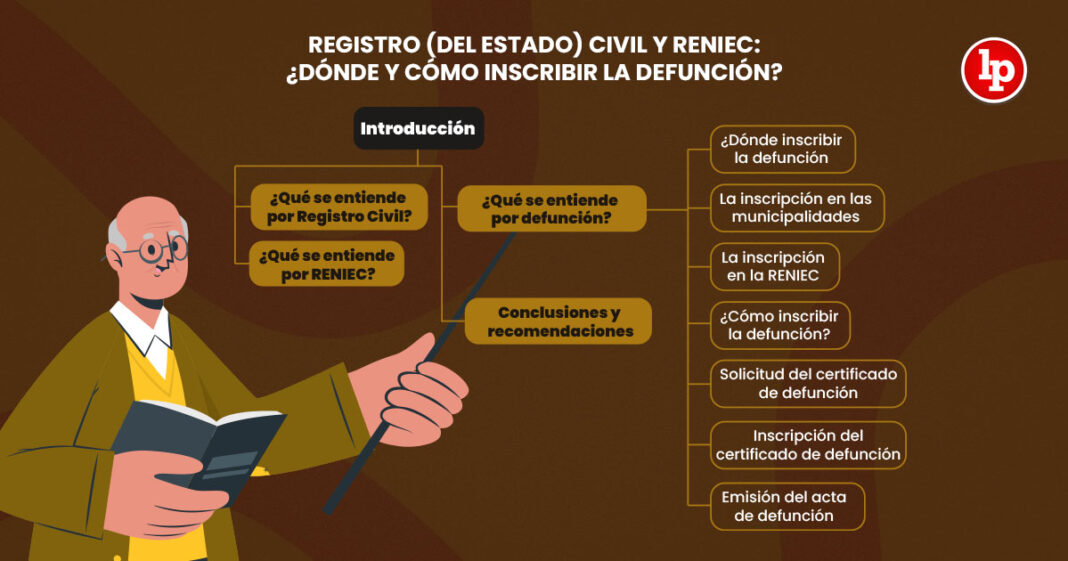 Sumario.- 1. Introducción, 2. ¿Qué se entiende por Registro (del Estado) Civil?, 3. ¿Qué se entiende por Reniec?, 4. ¿Qué se entiende por defunción (o muerte)?, 5. ¿Qué se entiende por certificado de defunción?, 6. ¿Dónde inscribir la defunción?, 6.1. La inscripción (del Estado Civil) en las municipalidades: El Registro del Estado Civil Municipal, 6.2. La inscripción (del Estado Civil) en el Reniec, 7. ¿Cómo inscribir la defunción?, 7.1. Solicitud del certificado de defunción, 7.2. Inscripción del certificado de defunción, 7.3. Emisión del acta de defunción que cancele el DNI del fallecido, 8. Diferencias entre el certificado y el acta de defunción a través de sus características, 8.1. Características del certificado (médico) de defunción, 8.2. Características del acta de defunción, 9. Conclusiones y recomendaciones, 10. Bibliografía.