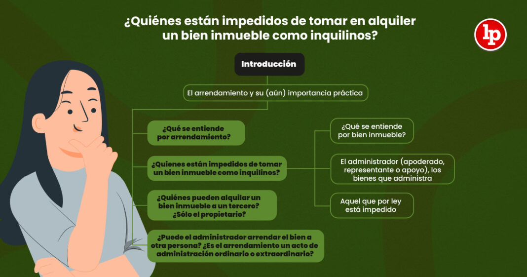 Sumario.- 1. Introducción: el arrendamiento y su (aún) importancia práctica, 2. ¿Qué se entiende por arrendamiento?, 3. ¿Quiénes están impedidos de tomar en alquiler un bien inmueble como inquilinos?, 3.1. ¿Qué se entiende por bien inmueble?, 3.2. El administrador (apoderado, representante o apoyo), los bienes que administra, 3.3. Aquel que por ley está impedido, 4. ¿Quiénes pueden alquilar un bien inmueble a un tercero? ¿Sólo el propietario?, 5. ¿Puede el administrador arrendar el bien a otra persona? ¿Es el arrendamiento un acto de administración ordinario o extraordinario?, 6. Conclusiones, 7. Bibliografía.
