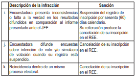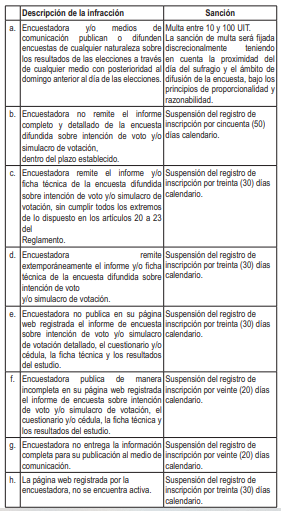 El JNE publicará en una sección visible de su página web y en sus canales de difusión o comunicación, la relación de encuestadoras y medios de comunicación que incumplen las exigencias del reglamento, las infracciones cometidas y las sanciones impuestas detallando el inicio y la culminación de éstas, así como las encuestadoras que no teniendo registro en el SREE difundan o publiquen encuestas electorales o simulacros de votación.