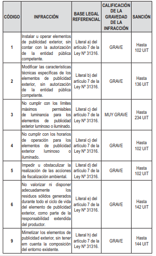 20.1 Constituyen infracciones administrativas relacionadas al incumplimiento de las obligaciones contenidas en el artículo 7 de la Ley Nº 31316, Ley de Prevención y Control de la Contaminación Lumínica: