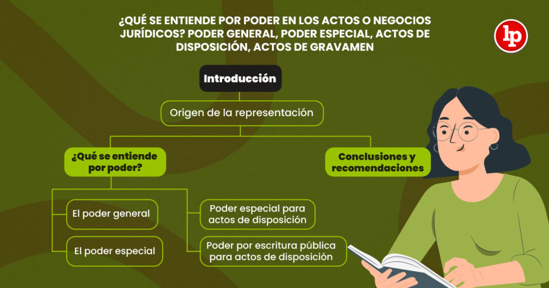 Sumario. 1. Introducción: origen de la representación, 2. ¿Qué se entiende por poder?, 2.1. El poder general, 2.2. El poder especial, 2.3. Poder especial para actos de disposición, 2.4. Poder por escritura pública para actos de disposición, 2.4.1. Los actos de disposición, 2.4.2. Los actos de gravamen, 2.4.3. En forma indubitable, 2.4.4. La escritura pública, 2.4.5. Los actos con formalidad ad probationem y formalidad ad solemnitatem, 3. Conclusiones y recomendaciones, 4. Bibliografía.