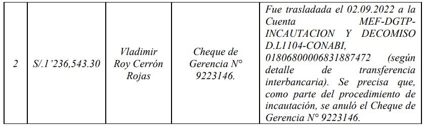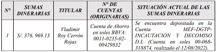 SEGUNDO.- EXTINGUIR EL DOMINIO y todos los derechos que sobre las sumas dinerarias de S/. 376, 969.13 (Trescientos setenta y seis mil novecientos sesenta y nueve con 13/100 soles) y S/. 1’236,543.30 (Un millón doscientos treinta y seis mil quinientos cuarenta y tres con 30/100 soles) que ostente el ciudadano peruano VLADIMIR ROY CERRÓN ROJAS, identificado con DNI Nro. XXXX. (…)