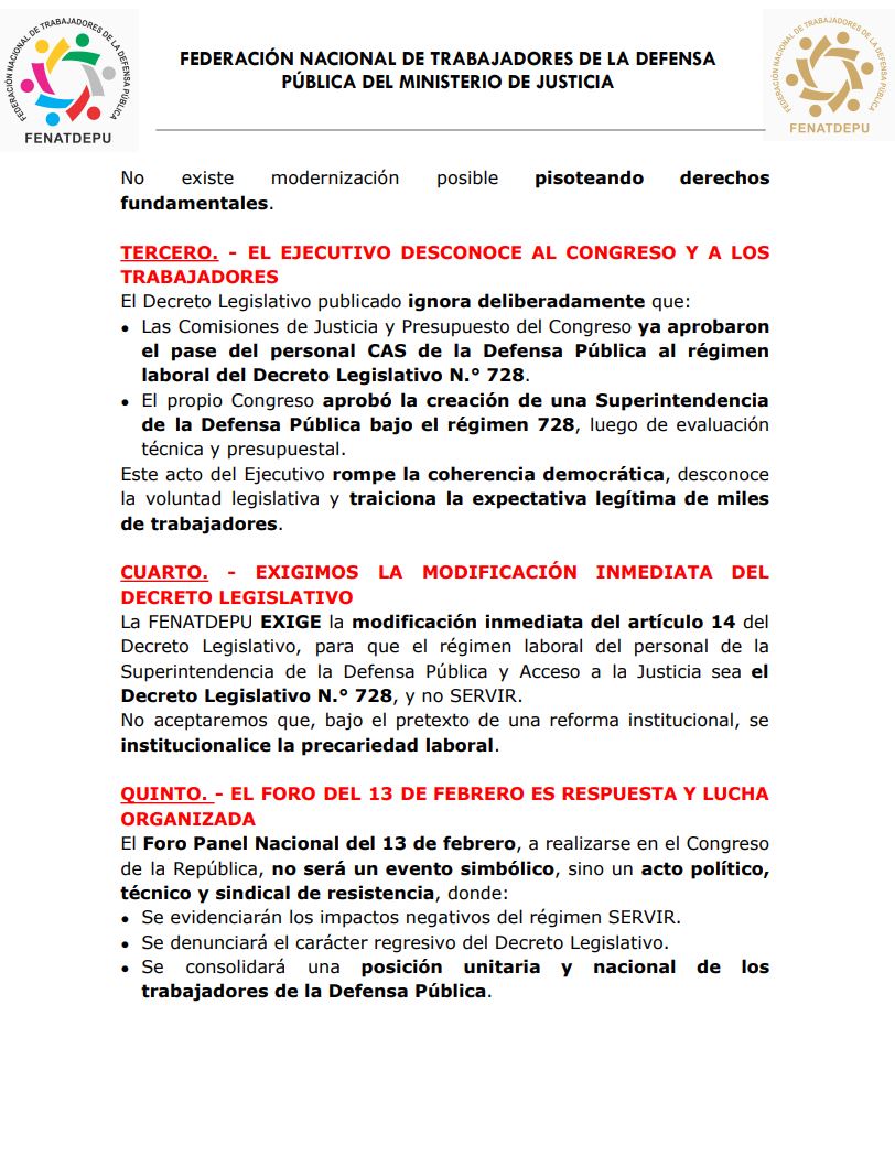 El gremio sostiene que la norma desconoce decisiones previas del Congreso orientadas —según indica— al régimen 728, por lo que exige modificar el decreto para cambiar el marco laboral del personal. En su pronunciamiento, advirtió que la medida afectaría la estabilidad de quienes sostienen el servicio de defensa pública.