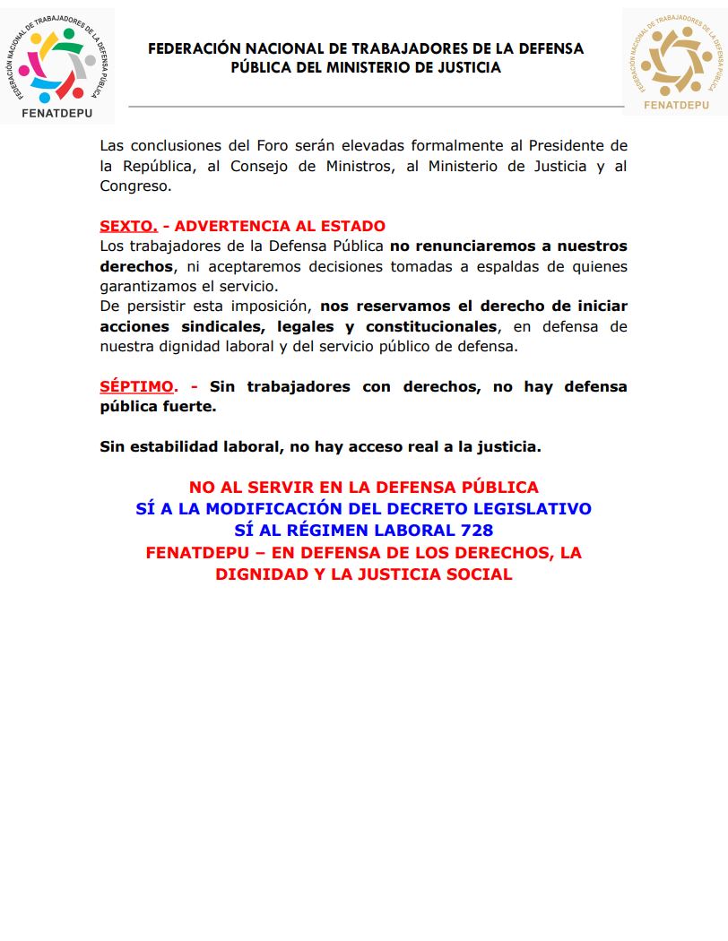 SEXTO. – ADVERTENCIA AL ESTADO Los trabajadores de la Defensa Pública no renunciaremos a nuestros derechos, ni aceptaremos decisiones tomadas a espaldas de quienes garantizamos el servicio.