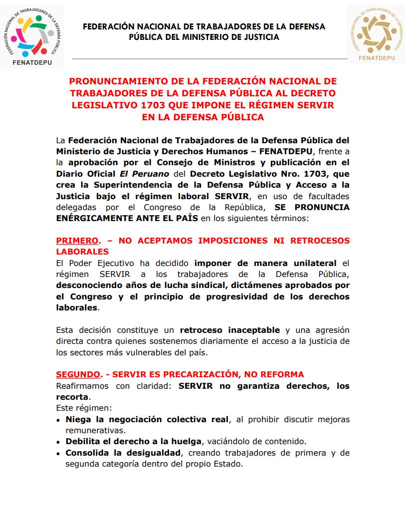 La Federación Nacional de Trabajadores de la Defensa Pública del Ministerio de Justicia y Derechos Humanos – FENATDEPU, frente a la aprobación por el Consejo de Ministros y publicación en el Diario Oficial El Peruano del Decreto Legislativo Nro. 1703, que crea la Superintendencia de la Defensa Pública y Acceso a la Justicia bajo el régimen laboral SERVIR, en uso de facultades delegadas por el Congreso de la República, SE PRONUNCIA ENÉRGICAMENTE ANTE EL PAÍS en los siguientes términos: