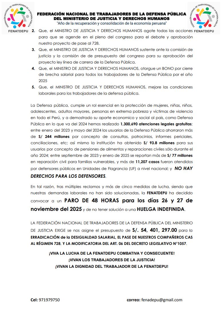 En tal razón, tras múltiples reclamos y más de cinco medidas de lucha, siendo que nuestras demandas laborales no han sido solucionadas, la FENATDEPU ha decidido convocar a un PARO DE 48 HORAS para los días 26 y 27 de noviembre del 2025 y de no tener solución a una HUELGA INDEFINIDA.