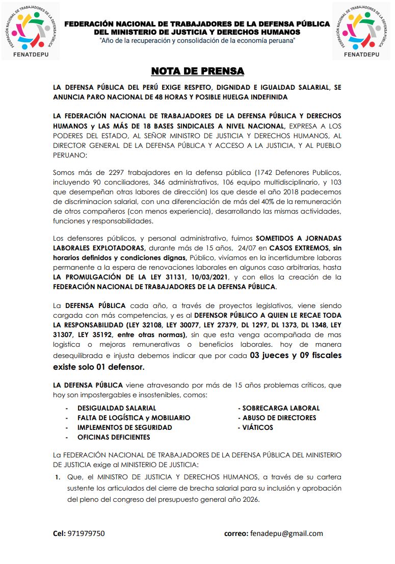 LA DEFENSA PÚBLICA DEL PERÚ EXIGE RESPETO, DIGNIDAD E IGUALDAD SALARIAL, SE ANUNCIA PARO NACIONAL DE 48 HORAS Y POSIBLE HUELGA INDEFINIDA