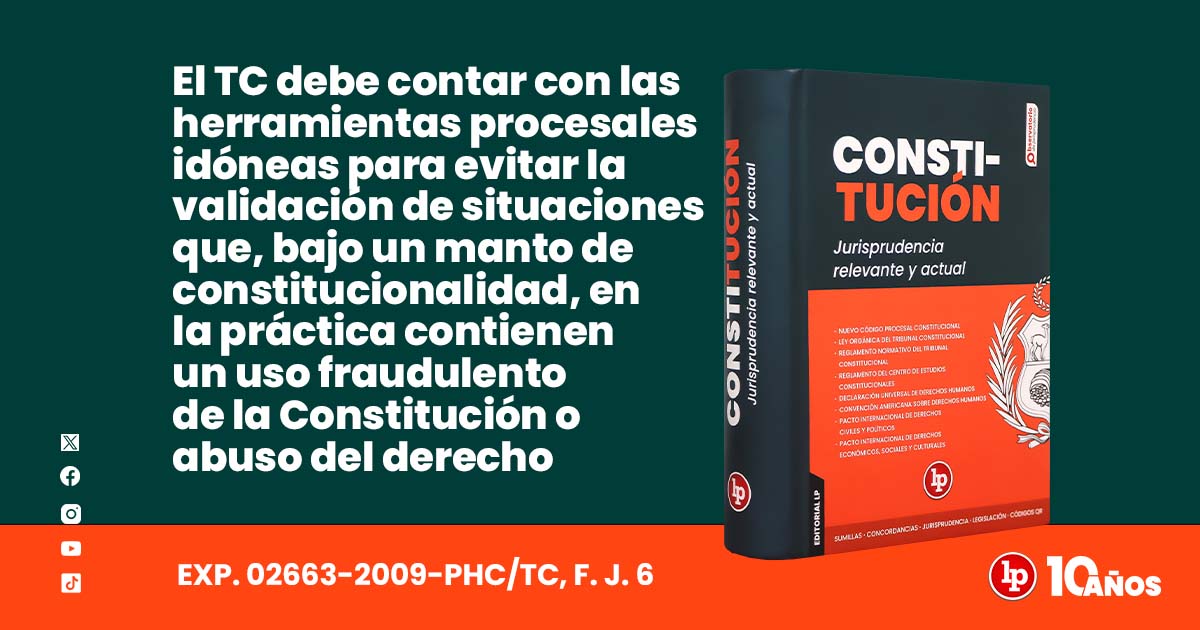 Fundamento destacado: 6. Si corresponde al Tribunal Constitucional la protección del orden constitucional, este debe estar provisto de las herramientas e instrumentos procesales idóneos para tal efecto, para evitar que por «defecto», se terminen constitucionalizando situaciones que, aunque aparecen revestidas de un manto de «constitucionalidad», en la práctica contienen un uso fraudulento de la Constitución o bajo el manto protector de los derechos fundamentales, se pretenda convalidar la vulneración de aquellos o una situación en la que se ha configurado un abuso de derecho.