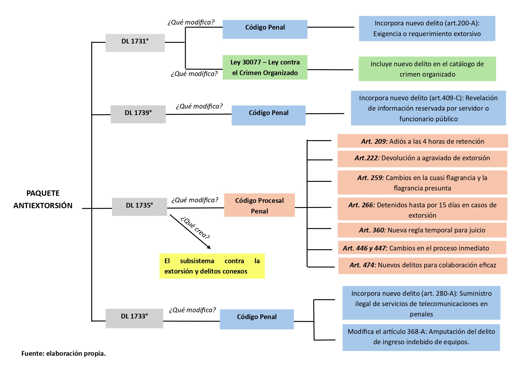 Sumario: 1. A modo de introducción, 2. Desarrollo, 2.1. Subsistema contra la extorsión y delitos conexos, 2.2. Cambios introducidos en el Código Penal, 2.3. Cambios introducidos en el Código Procesal Penal, 2.4. Cambio introducido en la Ley 30077 – Ley contra el Crimen Organizado, 3. A modo de cierre.