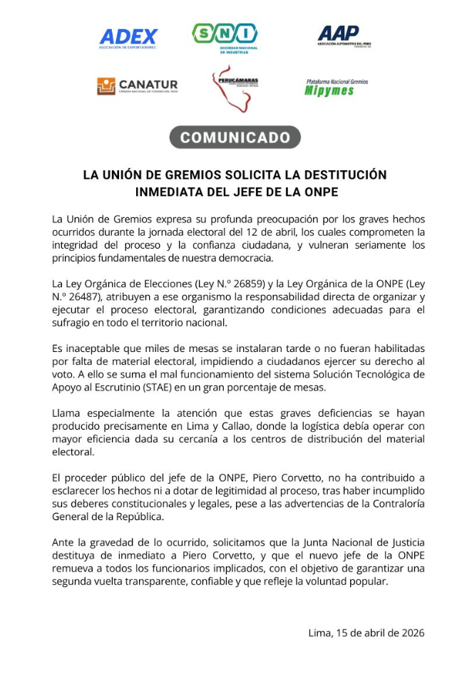 La Unión de Gremios expresó su preocupación por los hechos ocurridos durante la jornada electoral del 12 de abril, señalando que estos habrían afectado la integridad del proceso y la confianza ciudadana. En un comunicado, indicó que la Oficina Nacional de Procesos Electorales (ONPE), conforme a la Ley Orgánica de Elecciones y su propia ley orgánica, tiene la responsabilidad de organizar y ejecutar los comicios en condiciones adecuadas. Asimismo, cuestionó la instalación tardía o falta de habilitación de mesas de votación y reportó fallas en el sistema Solución Tecnológica de Apoyo al Escrutinio (STAE).